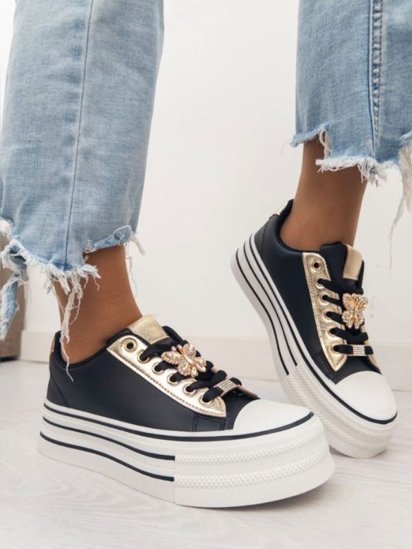 Deportiva de polipiel en negro con dorado y detalle de un broche un sus cordones que si quieres se puede retirar.