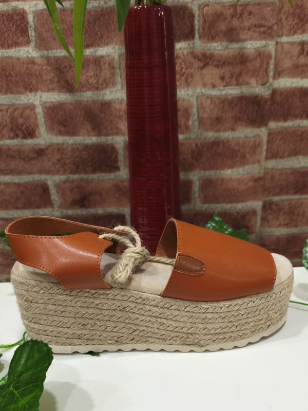 Sandalia con plataforma de esparto con cierre de cordón de esparto y plantilla con gel. (Medidas de la plataforma 7,5CM Y 5CM en la parte delantera).